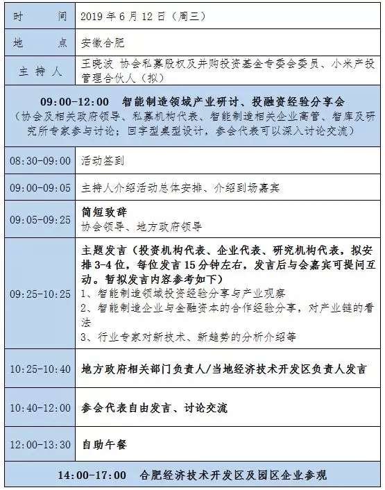 2.因会议名额有限,仅限长期关注并重点投资智能制造产业的私募股权、创投机构委派代表参加,要求投资总监、合伙人或相应级别负责人出席(限1-2位)。收到报名申请后,协会将按照一定程序筛选资料,确定最终参会名单后,将为参会嘉宾发送确认邮件及短信。会议当天请参会嘉宾凭纸质名片和确认短信签到。未提前报名并经协会确认,请恕不能予以接待。