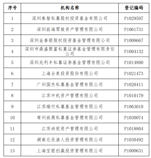深圳泰智私募股权投资基金有限公司等13家私募基金管理人存在异常经营情形,且未能在书面通知发出后的3个月内提交符合规定的专项法律意见书,协会将注销该13家机构的私募基金管理人登记。已注销的私募基金管理人和相关当事人,应当根据法律法规、证监会规定以及协会相关自律规则、基金合同约定,妥善处置在管基金财产,依法保障投资者的合法利益。